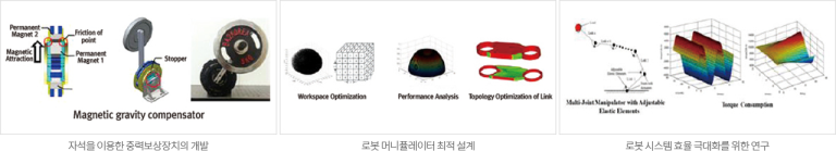 The major research topics of the Robot Design Lab include the optimal design of robotic manipulators, the design methodology for manipulators, design and motion generation for energy efficiency maximization, analyses of control, and the design parameters of underactuated systems. The lab performs research on design methods that analyze kinematic/dynamic performances of robotic systems, define parameters that can quantitatively evaluate the performance, and thereby optimize the performance by linking these parameters logically. Also the lab studies the gravity compensation mechanism that can handle large payloads, and efficient robotic systems that can be used maximally for the system’s dynamic characters and underactuated systems.