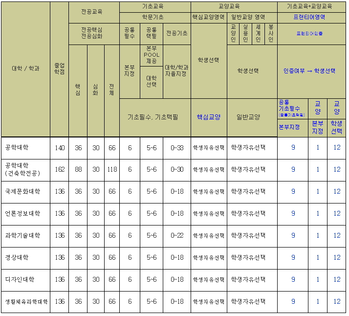 | 캠퍼스 | 대학 및 학과 | (프런티어 인증) (공통기초필수+교양) |