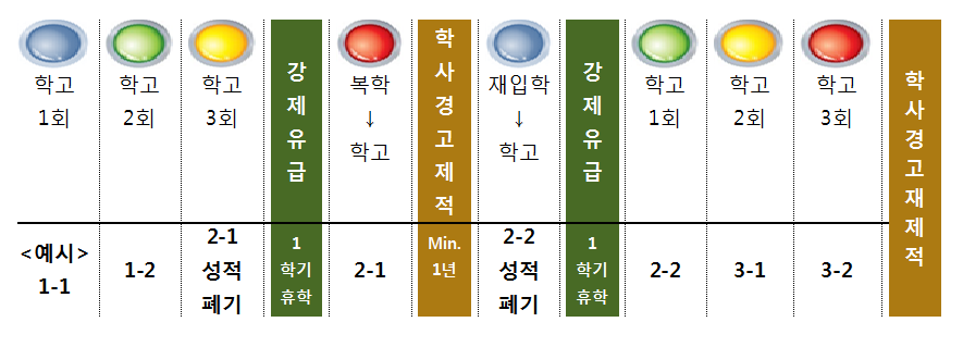 제41조(학사경고) 제2항에 근거하여, 재학 기간 중 연속 3회의 학사경고를 받은 학생에 대하여는 강제 유급 및 휴학을 실시하고, 복학한 학기에 학사경고를 받을 경우 제적한다. 다만, 연속 3회에 해당하는 마지막 학기 수강신청 학점 중 평점 평균에 포함되는 과목이 12학점 미만인 경우에는 학사경고를 부여하되, 해당 학사경고는 학사경고 이력에는 포함하지 않는다. 단, 학년별 최소 수강신청 학점에 미달한 학생은 학사경고 1회를 부여하며, 해당 경고는 학사경고 이력에 포함된다.